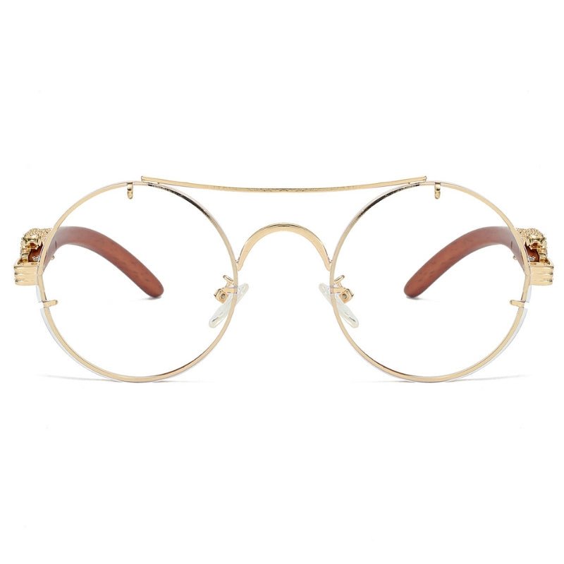 Cheetah Sunglasses bring commanding presence through a sculpted gold frame, polished animal detailing, and bold round lenses. Designed for expressive styling, the frame blends decorative form with structured geometry—highlighted by a sweeping top bar and curved arms. With UV400 lenses and intricate temple embellishments, Cheetah is built for both visibility and spectacle.