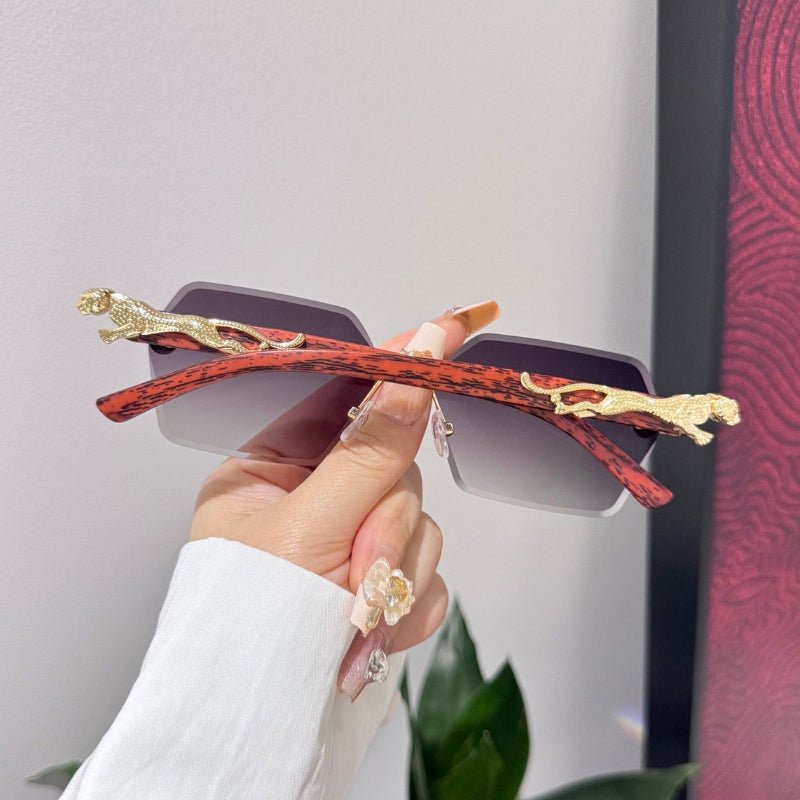 Boldly defined and visually striking, the Panthera Sunglasses feature geometric rimless lenses and sculpted panther accents in gold-tone hardware. The wood-textured arms and angular lens silhouette deliver a sharp edge, while the lightweight build ensures all-day comfort. Designed for those who move with confidence, these sunglasses bring a unique balance of strength and style.