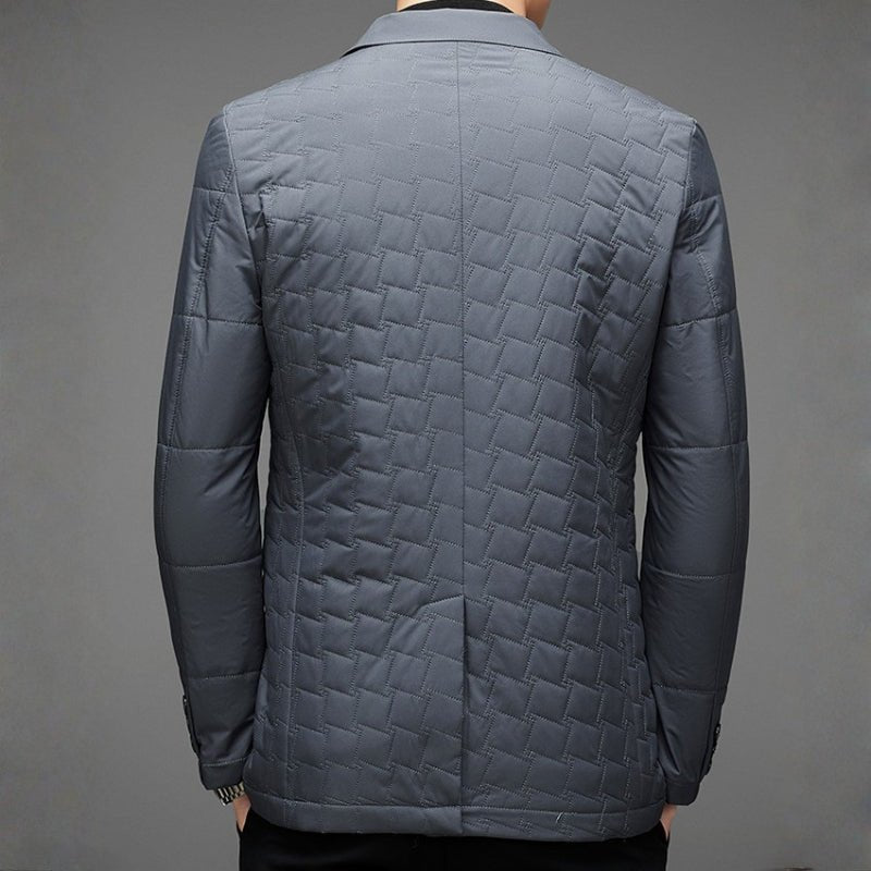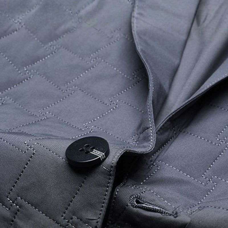 This quilted blazer provides lightweight insulation with a structured fit that layers easily over shirts or sweaters. Made from 100% polyester, it traps warmth while staying breathable for transitional weather. Diamond-pattern quilting adds subtle texture, complemented by a notched lapel and button-front closure for a clean, professional profile. Durable construction handles daily wear without bulk.