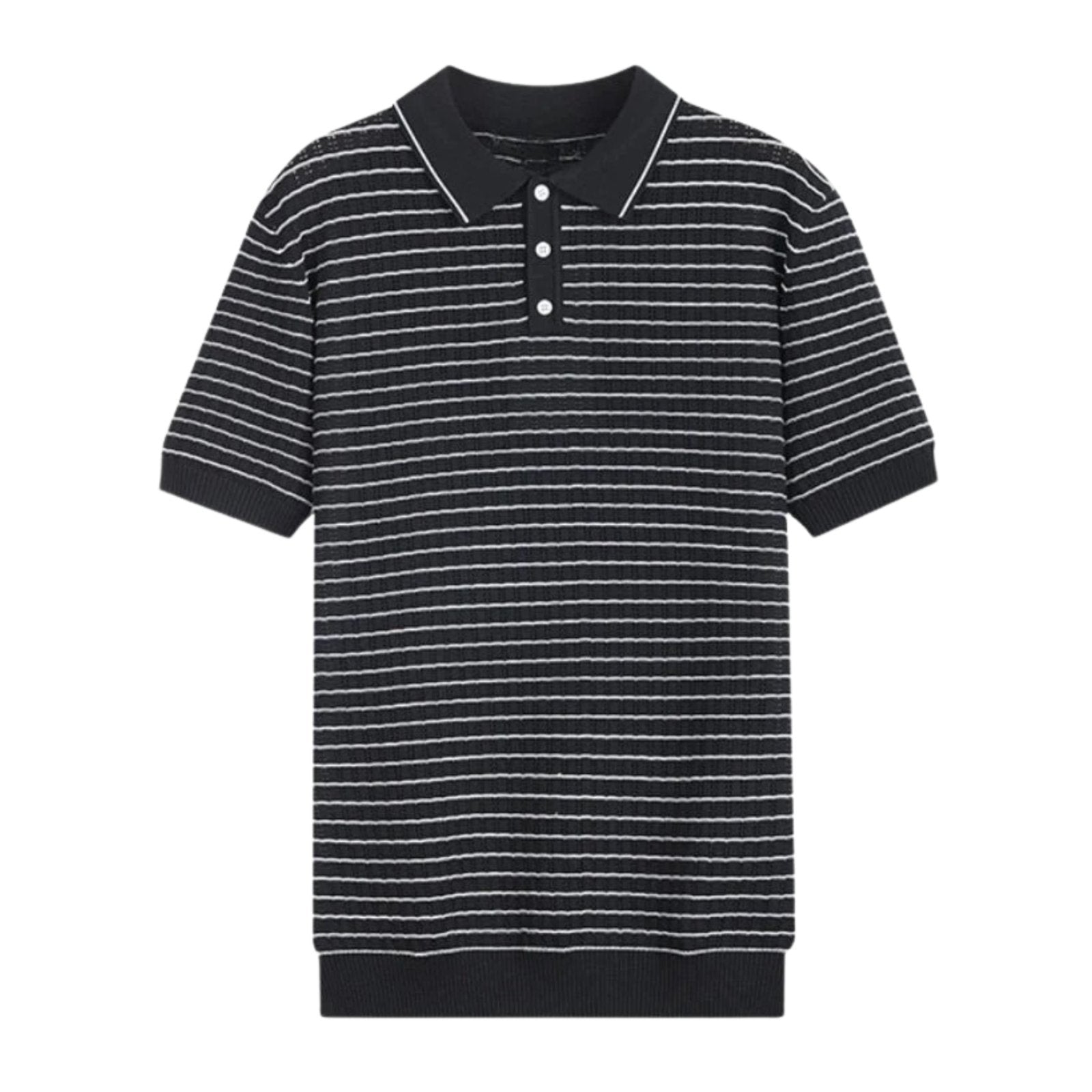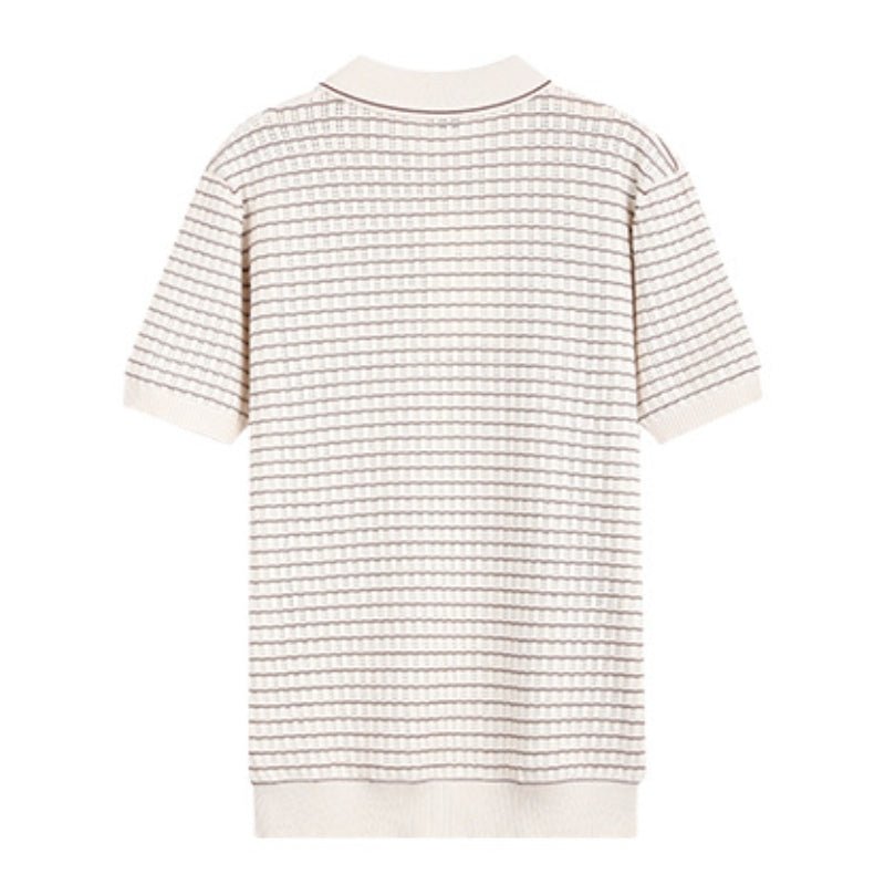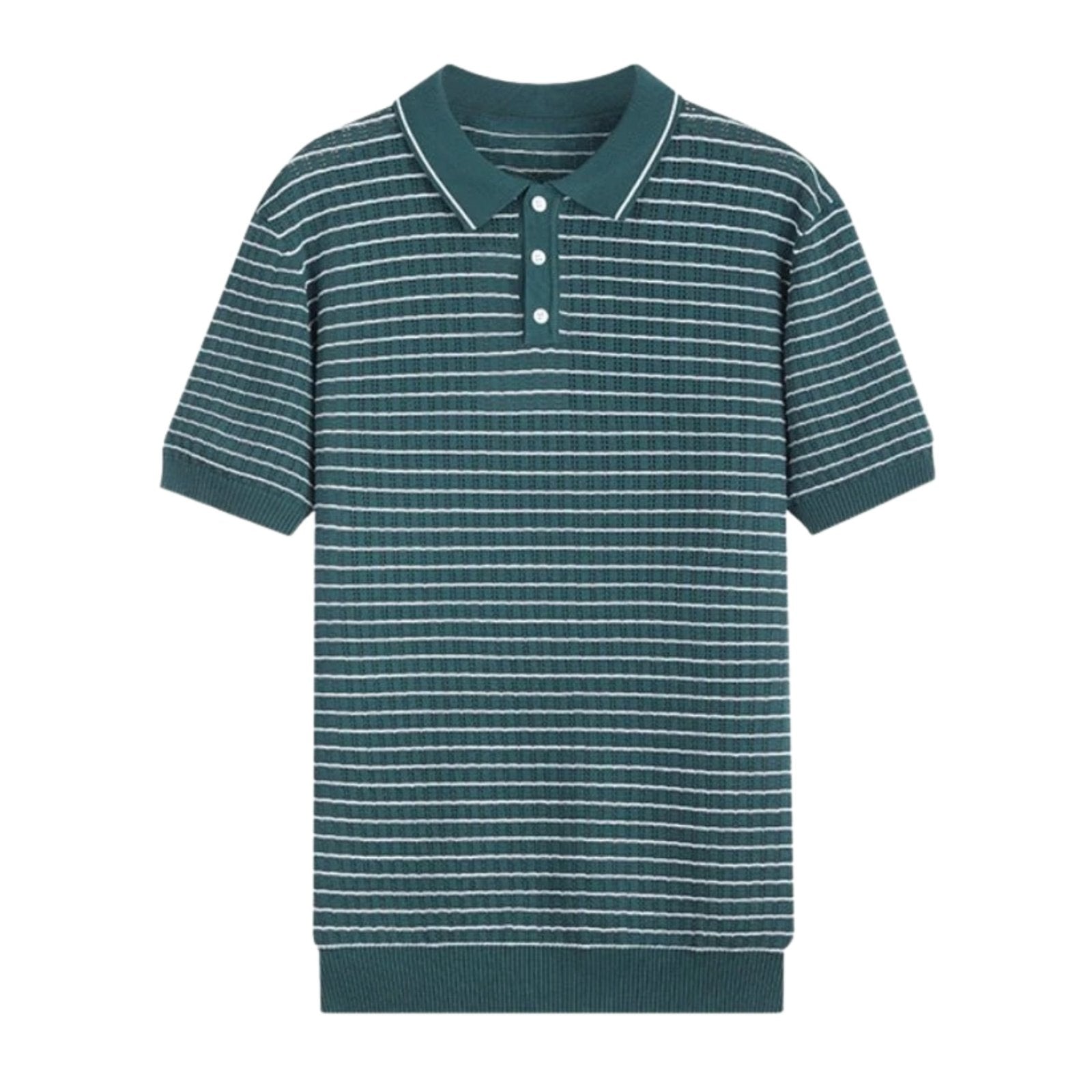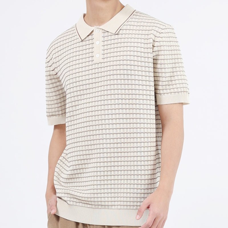 The Dane Polo blends breathable knit structure with clean, everyday style. Its open-stitch pattern and horizontal stripes create subtle texture, while the viscose-polyester blend offers stretch, softness, and a smooth finish. Finished with ribbed cuffs, a structured collar, and a three-button placket, the Dane Polo delivers a relaxed yet tailored look—ideal for warm days and easy pairing.