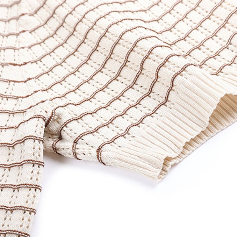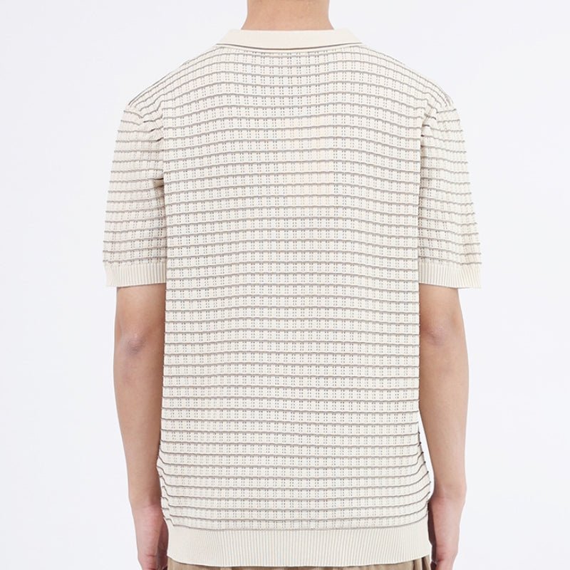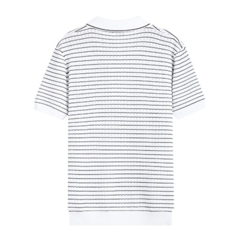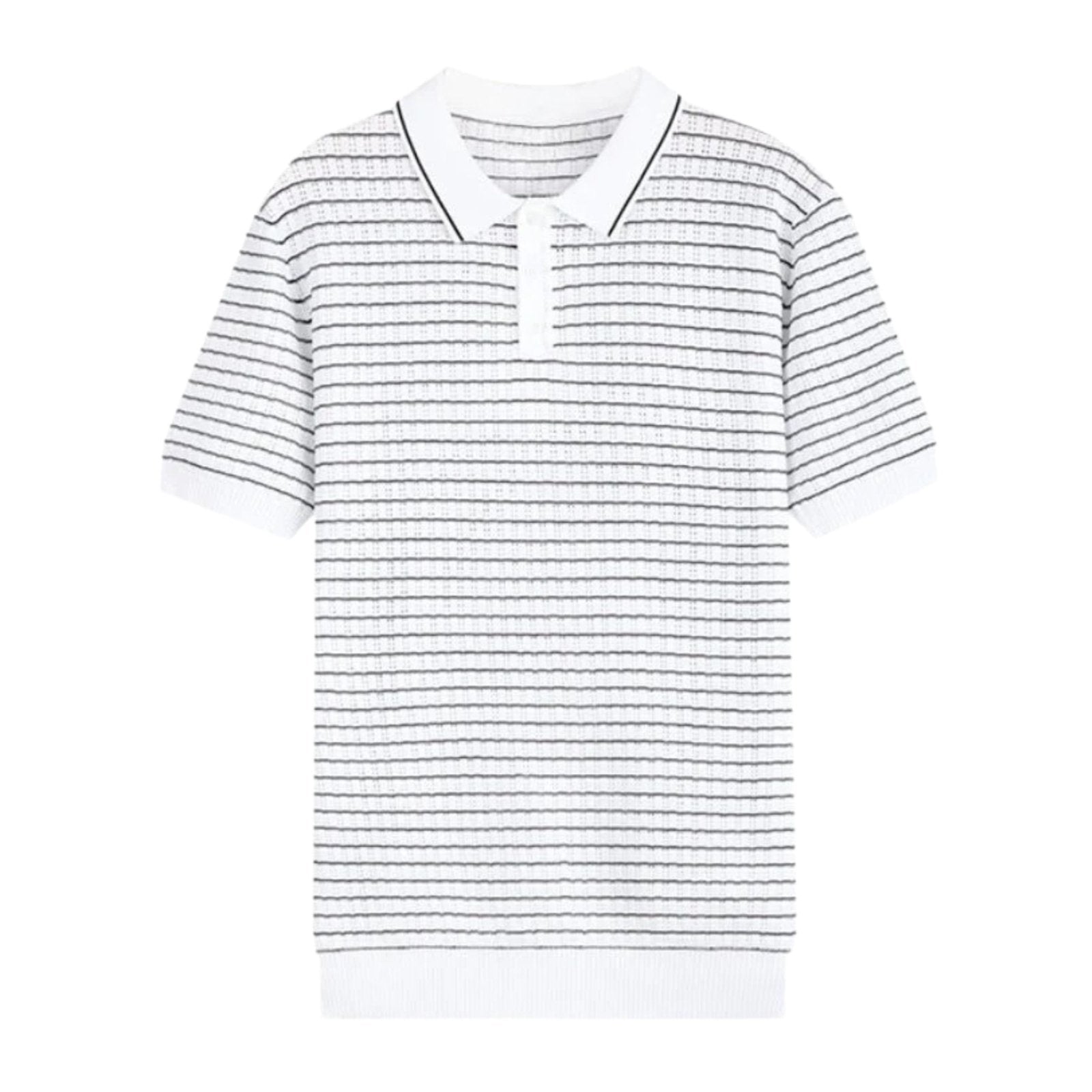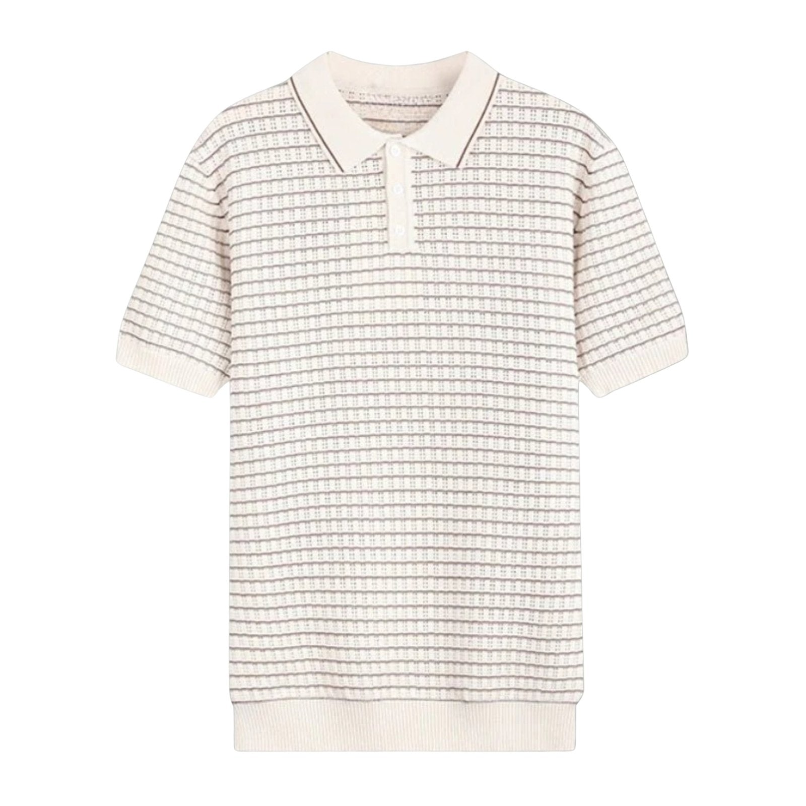 The Dane Polo blends breathable knit structure with clean, everyday style. Its open-stitch pattern and horizontal stripes create subtle texture, while the viscose-polyester blend offers stretch, softness, and a smooth finish. Finished with ribbed cuffs, a structured collar, and a three-button placket, the Dane Polo delivers a relaxed yet tailored look—ideal for warm days and easy pairing.