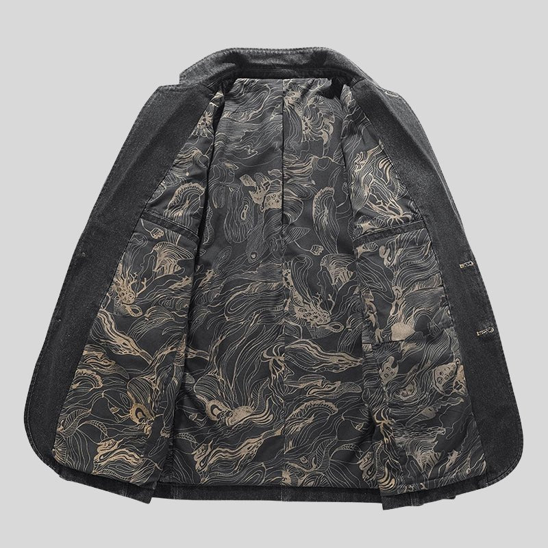 The Grantham Cotton Blazer combines structured tailoring with rugged texture in a cotton-polyester blend. Designed with a denim-inspired finish and a subtle distressed look, it offers relaxed polish for everyday wear. The printed inner lining adds an unexpected touch of character, while practical pocketing ensures functional ease across changing seasons.