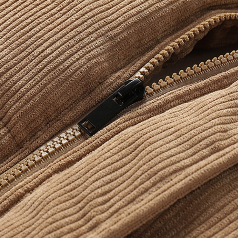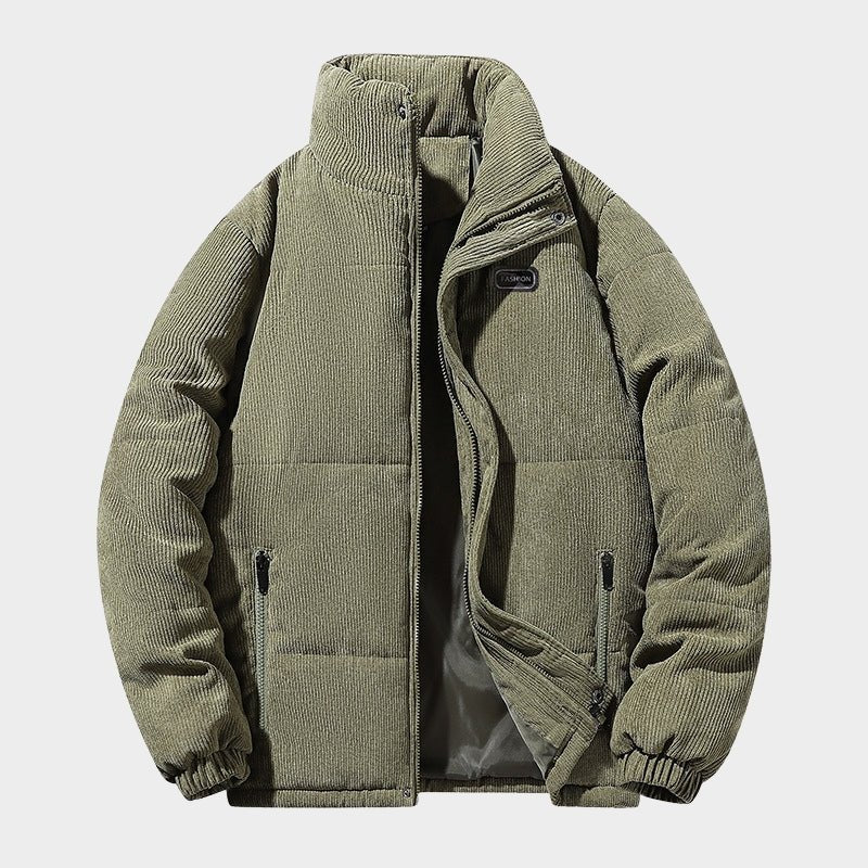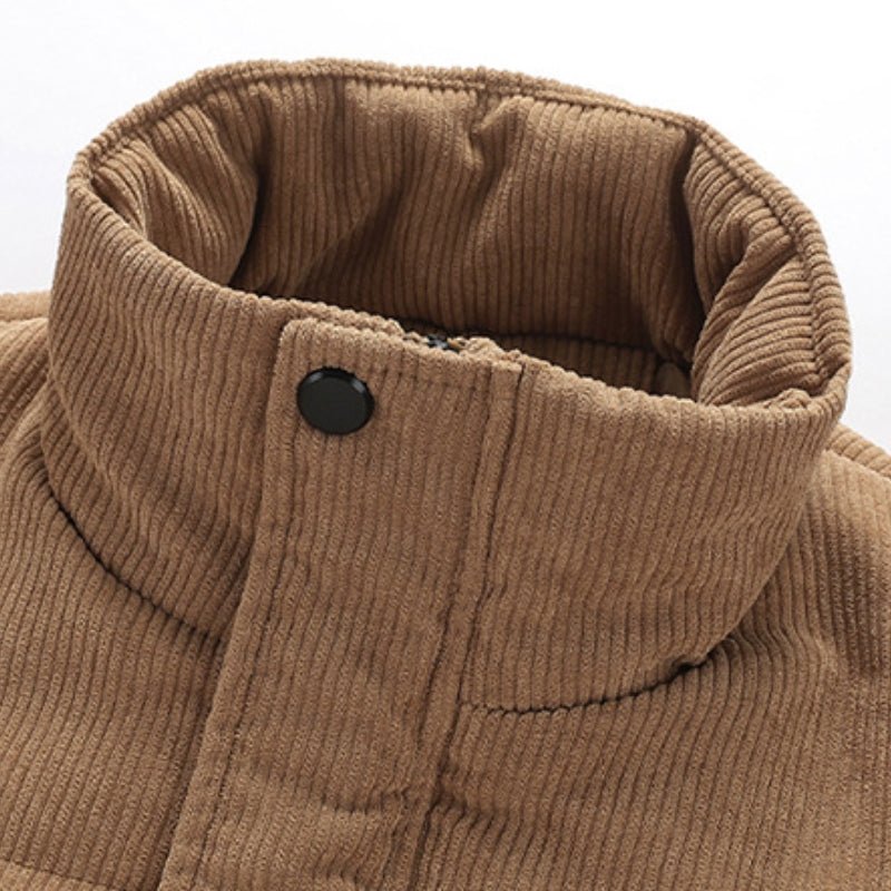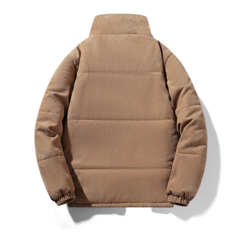 Built for everyday warmth and easy wear, this corduroy puffer jacket delivers insulated comfort with a structured, casual profile. Made from 100% polyester fiber corduroy, it offers a soft ribbed texture with reliable heat retention. A full zip front, stand collar, and elasticated cuffs help block out cold, while the padded construction provides consistent insulation without excess bulk. Designed for practical layering in cooler conditions.