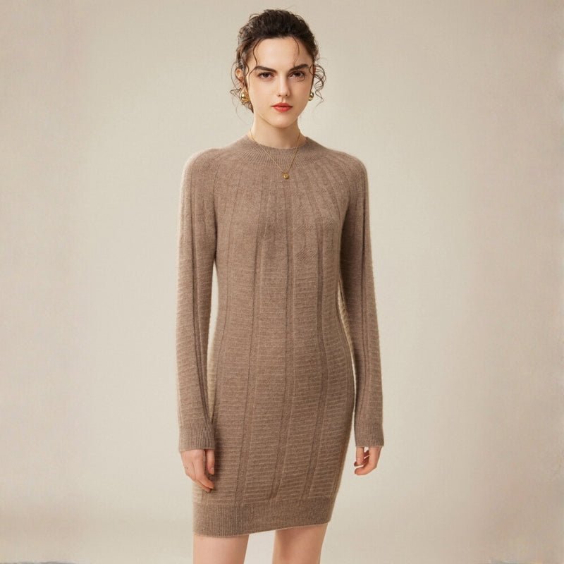 This dress offers insulating comfort from 100% cashmere, wrapping the body in soft, breathable warmth for transitional layers. The fitted silhouette with long sleeves and a clean crew neck provides a streamlined shape, while vertical rib details add refined texture. Its lightweight knit moves with ease, regulating temperature through daily shifts.