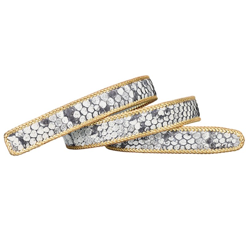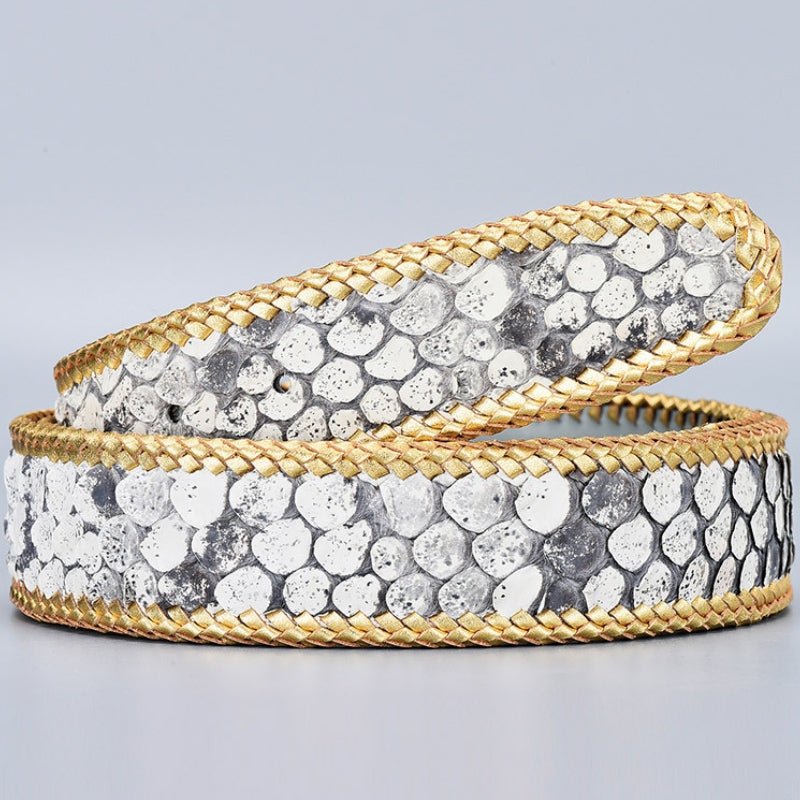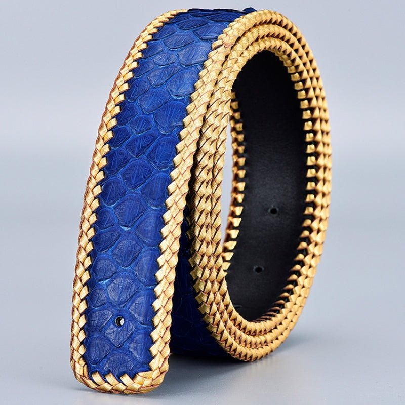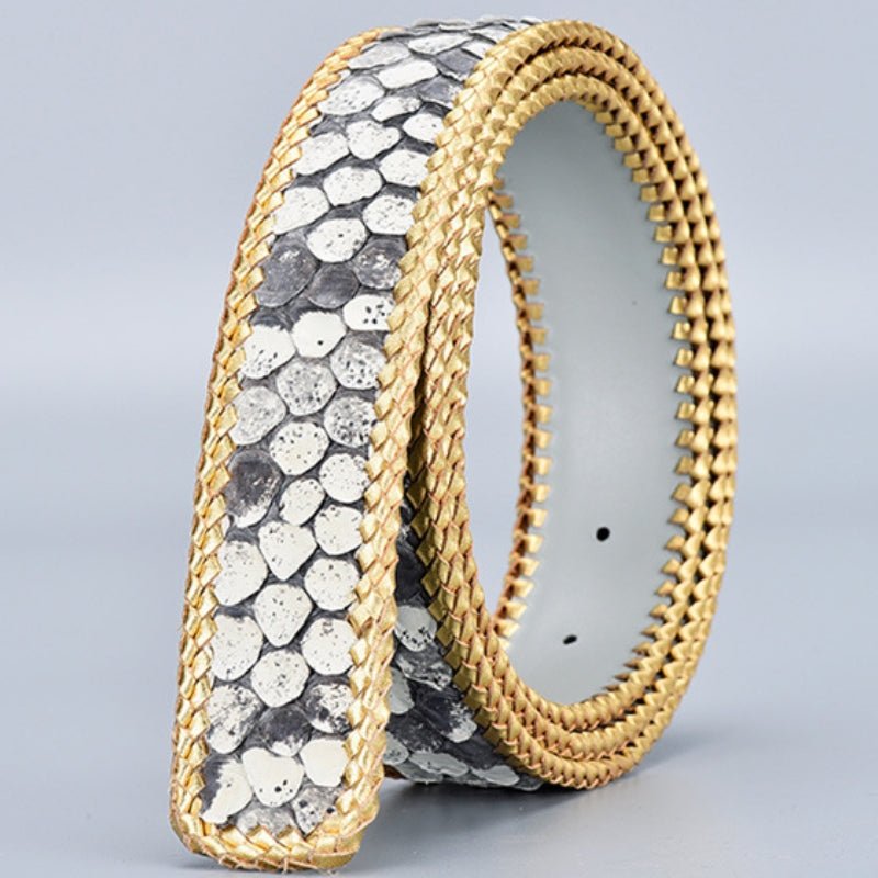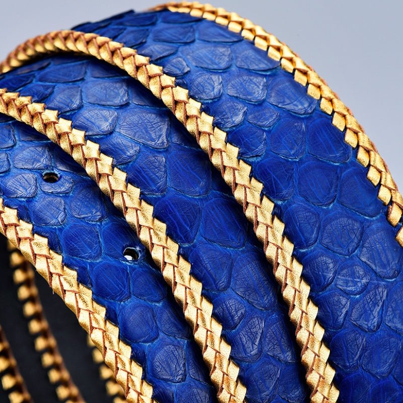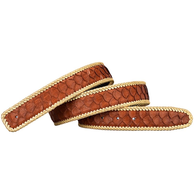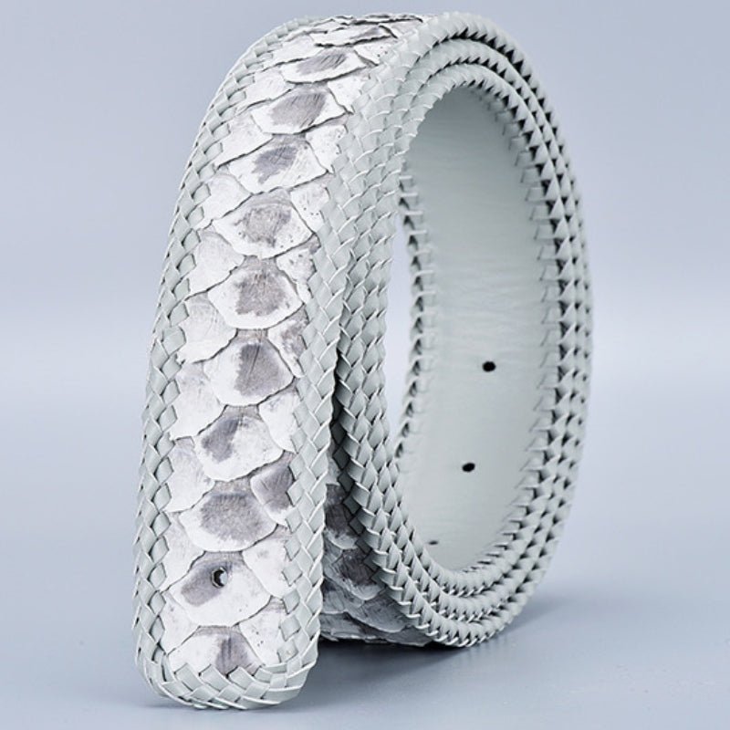 Designed for distinctive texture and long-lasting wear, this belt delivers structured support with a bold, natural surface. Made from genuine python skin leather, it features a pronounced scale pattern and hand-braided leather edging that reinforces the profile. The smooth leather backing adds comfort against the waist, while the clean cut and evenly spaced holes ensure reliable everyday fit for casual or tailored looks.