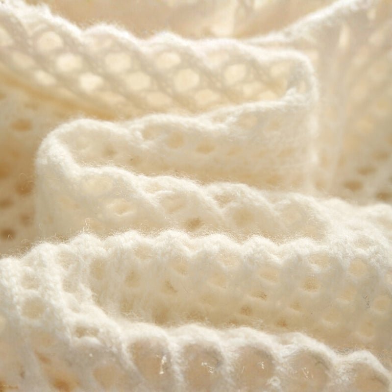 This open-knit sweater offers soft, breathable comfort through its blend of 30% cashmere and 70% wool, regulating temperature across seasons. The loose silhouette with drop shoulders and a wide crew neck allows easy layering, while the textured mesh structure adds visual interest without bulk. Natural insulation and moisture-wicking properties keep it fresh during extended wear.