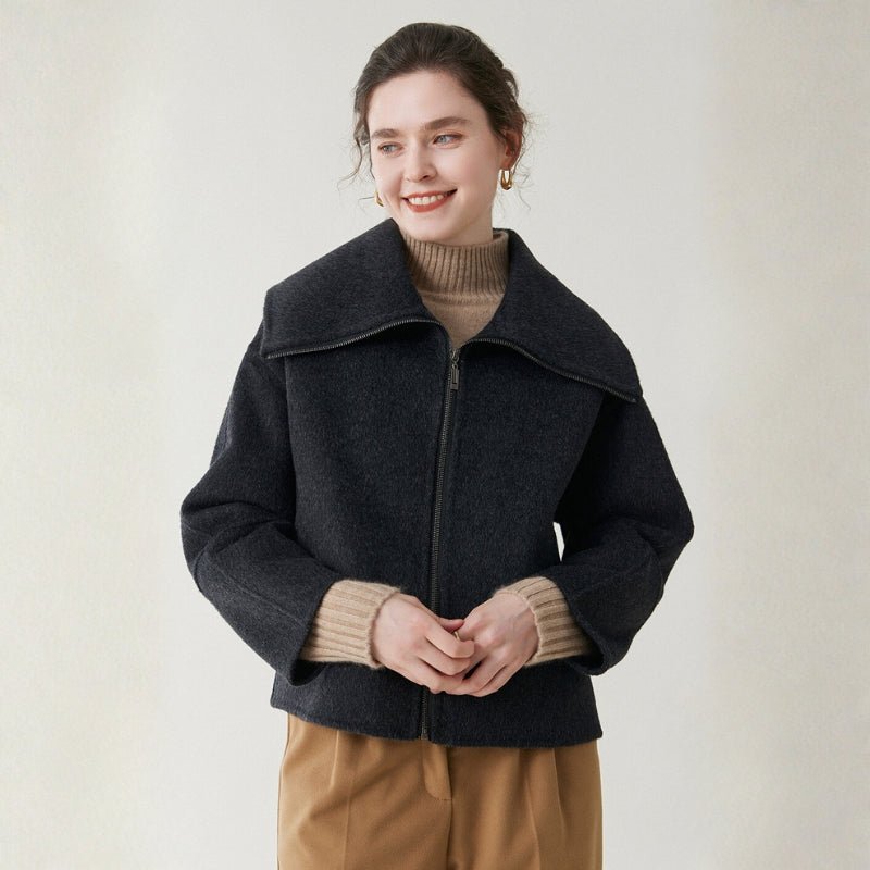 This jacket offers warm, breathable comfort with a 30% cashmere and 70% wool blend crafted for soft insulation. Its oversized collar, clean zip-front, and cropped silhouette create a structured layer suited for cool seasons. The dense wool-cashmere surface adds natural thermal regulation while maintaining a smooth, easy drape. A minimalist profile supports versatile styling over knits or base layers.