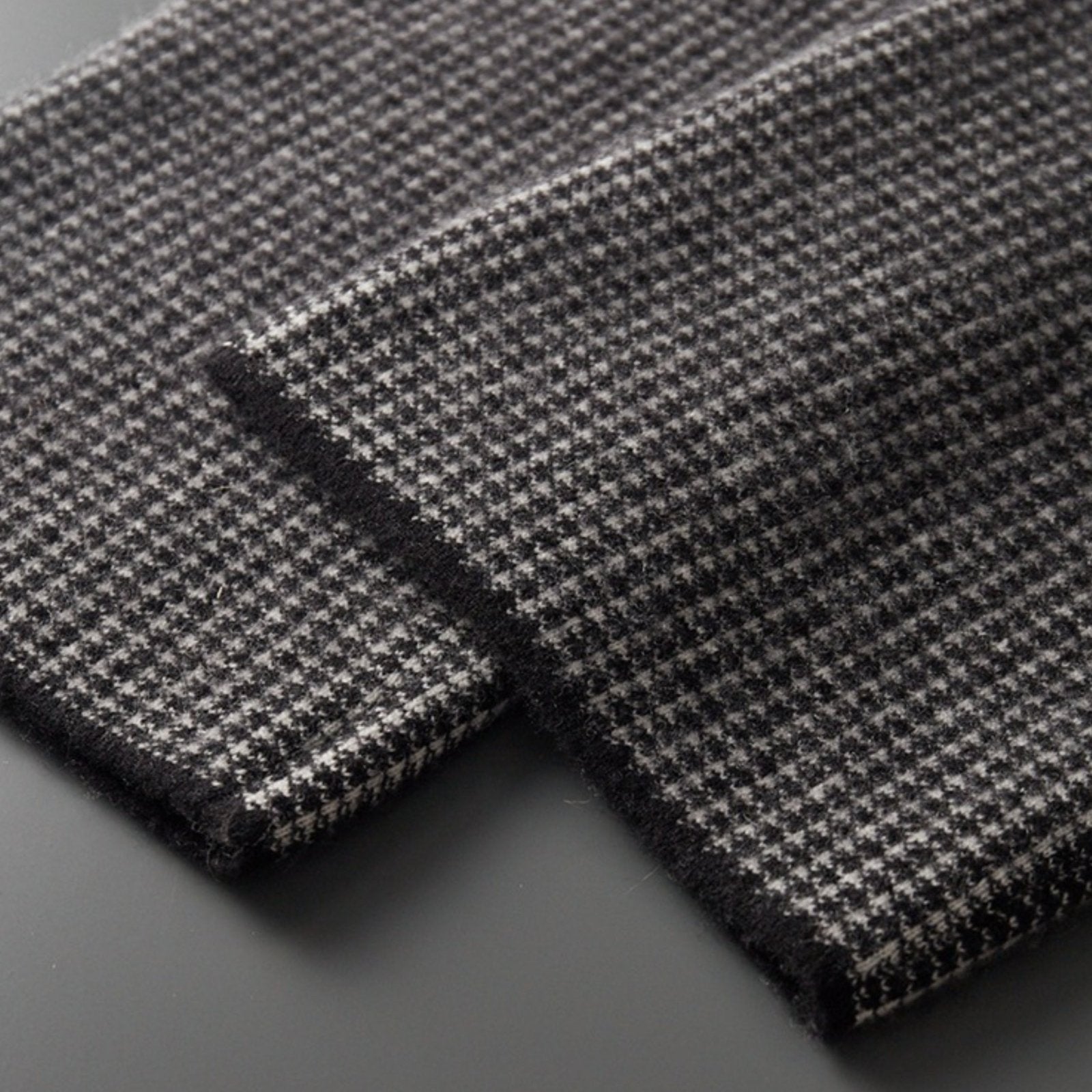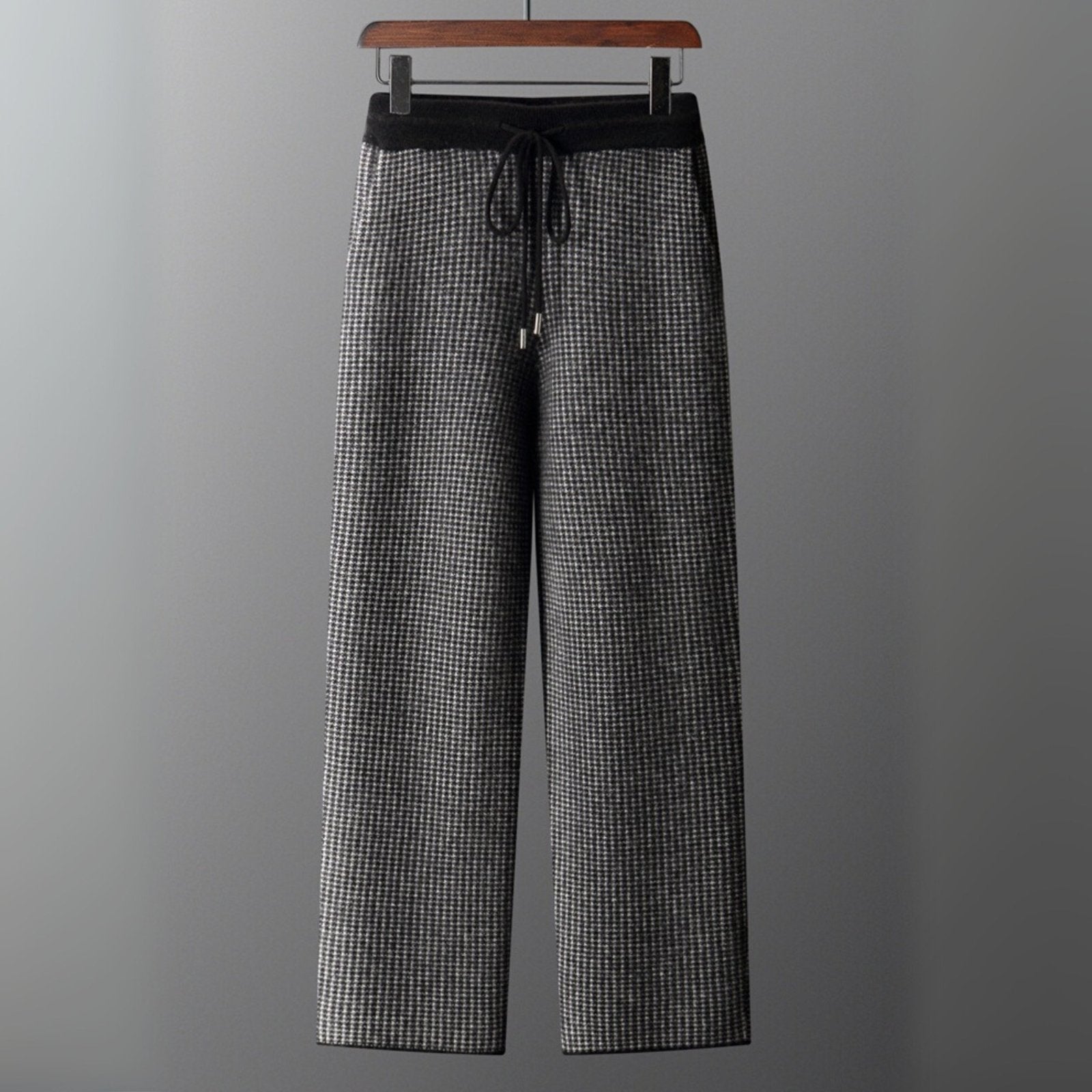 These pants provide versatile comfort with a soft, insulating blend of 35% cashmere and 65% wool. The houndstooth pattern adds visual interest, while the drawstring waist and ribbed trim ensure a secure fit. Straight legs offer easy movement, and the material delivers natural breathability and moisture-wicking properties for extended wear.