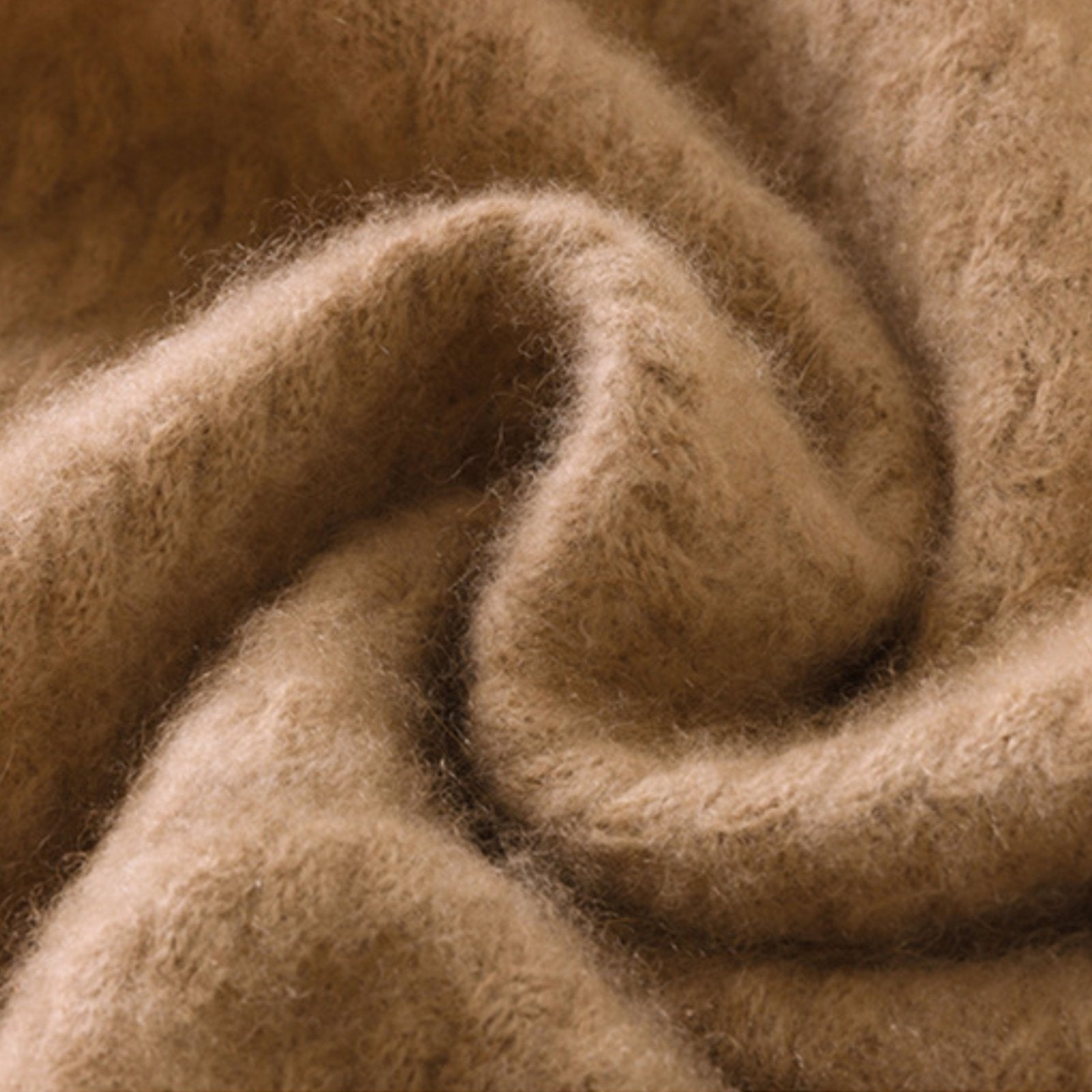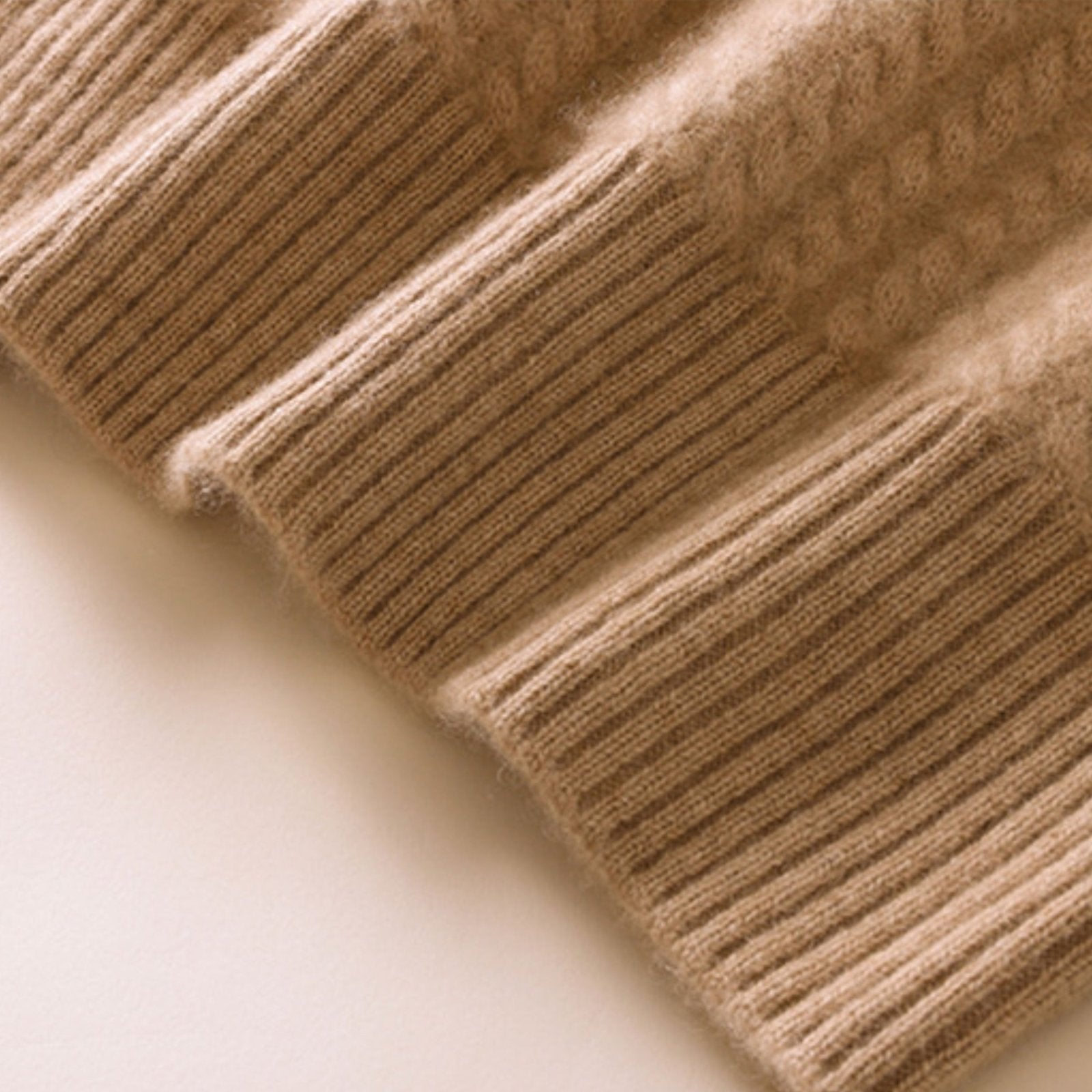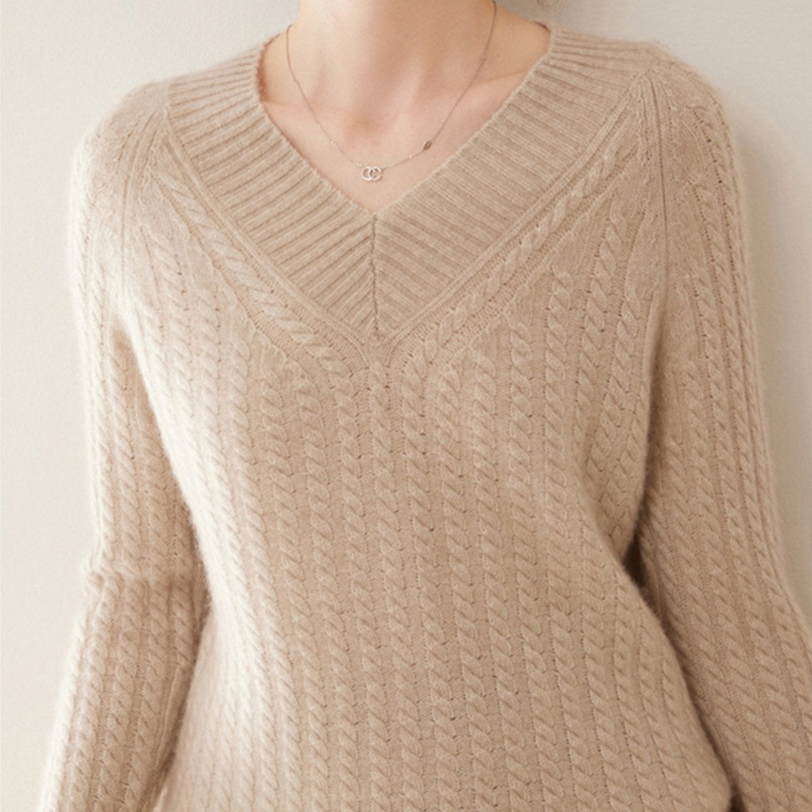 This sweater provides superior softness and insulation through 100% cashmere construction. The deep V-neck and cable knit pattern deliver a structured yet relaxed fit that layers smoothly under jackets. Long sleeves and ribbed hems ensure coverage during cooler days, while the material's natural breathability keeps you comfortable without overheating.