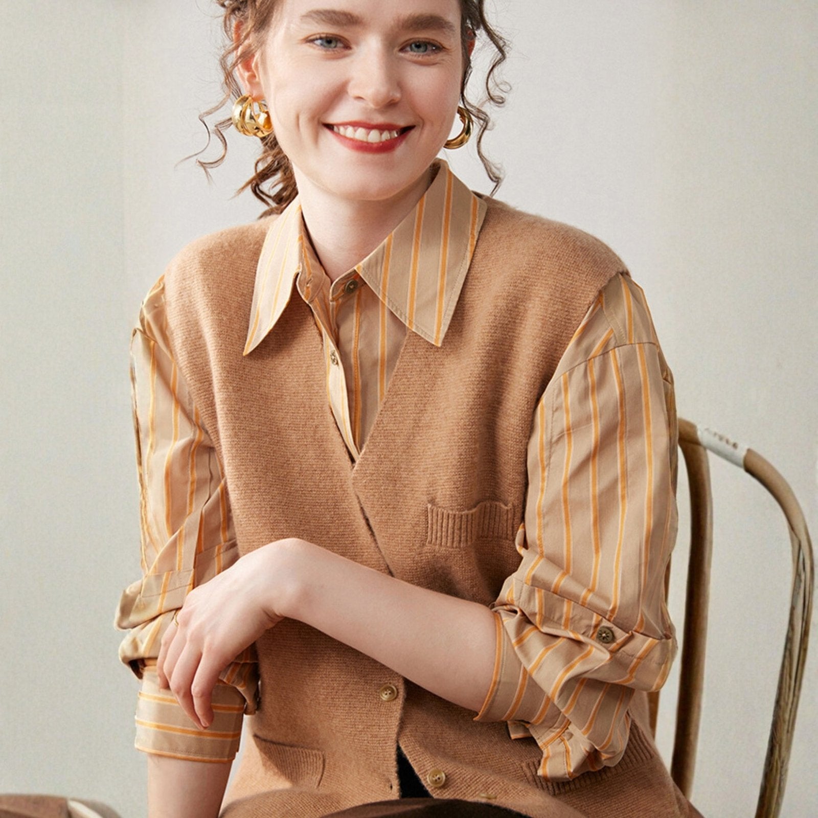 This vest provides versatile layering with insulating warmth from a 35% cashmere and 65% wool blend that feels soft against the skin. Button-front closure and patch pockets deliver a clean, structured fit over shirts or tees. Ribbed armholes and hem add subtle definition while the breathable knit maintains comfort through changing temperatures.