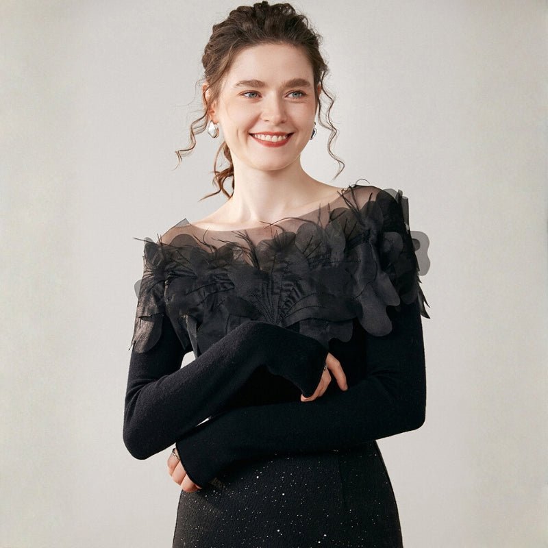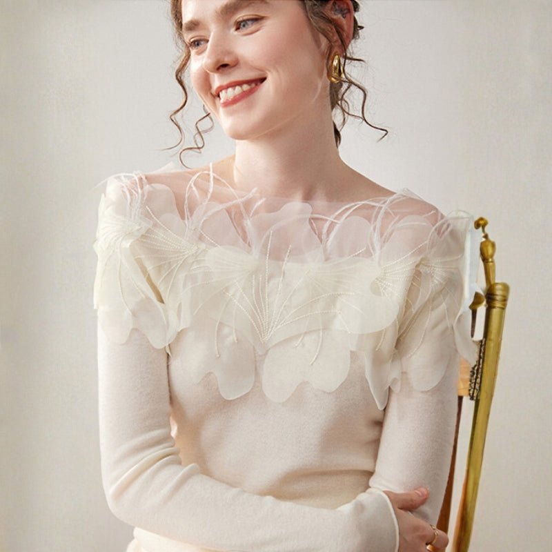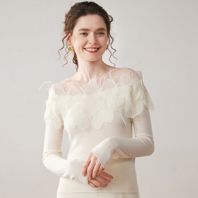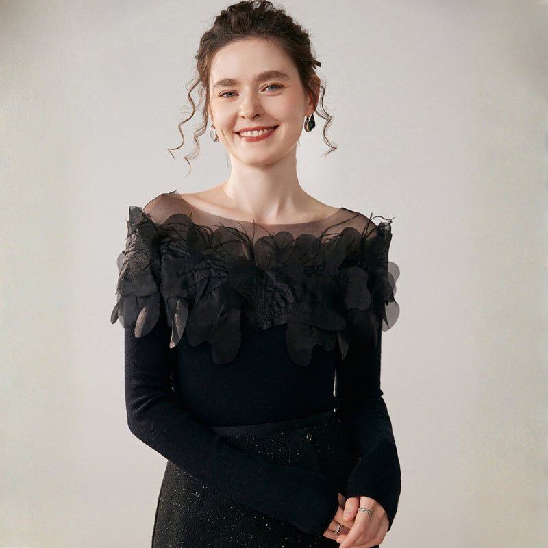 This cashmere blend sweater offers soft, insulating comfort that layers smoothly for transitional weather. Made from 30% cashmere and 70% wool, it features sheer petal overlays on the shoulders and upper chest for added texture without bulk. The fitted body and long sleeves move with you, while ribbed cuffs provide a clean finish. Natural breathability keeps it wearable from cool days to mild evenings.