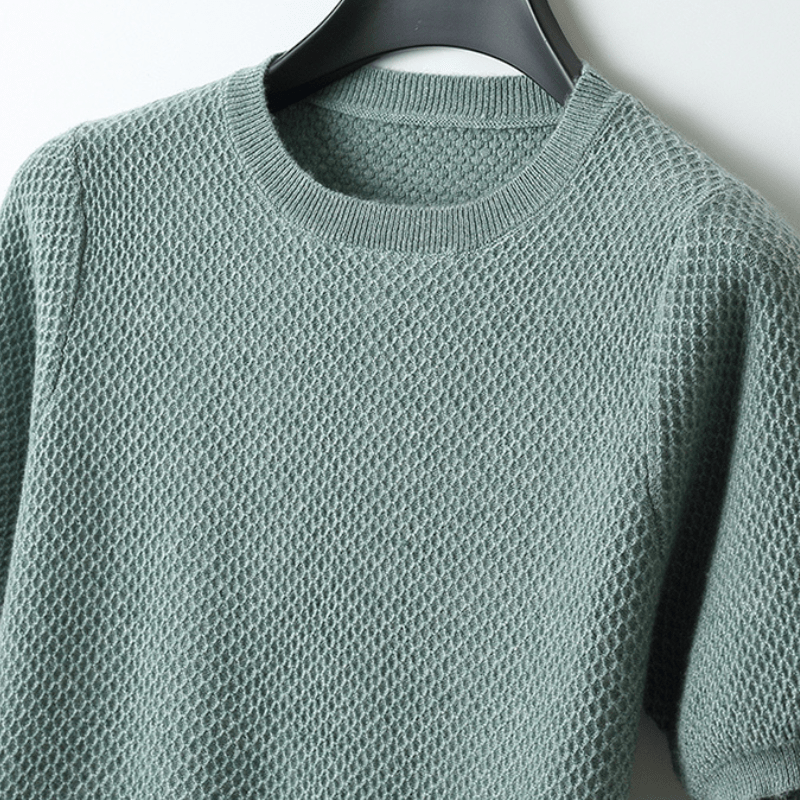 Crafted from 100% wool, the Crestwood Textured Knit Tee offers natural warmth, softness, and breathability in a lightweight design. Featuring a unique honeycomb knit pattern, this short-sleeve sweater provides a distinct look while ensuring comfort. Ribbed details at the collar, cuffs, and hem create a structured fit, making it an ideal piece for layering or wearing solo.